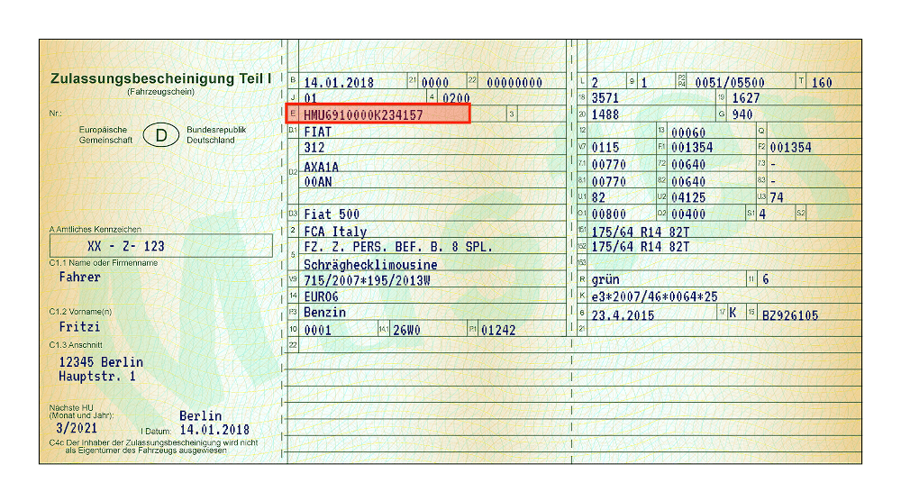 Auf der Vorderseite von Zulassungsbescheinigung Teil I finden Sie unter „E“ die Fahrzeug-Identifizierungsnummer Ihres Kfz.